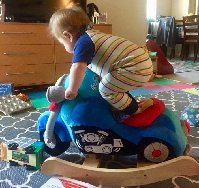 BURP! Wow, that must have been a good bottle! Now with a full stomach, he has a happy heart, and he’s ready to explore the living room full of toys that Mom rearranged last night. I hop off the computer and we play together while Mom does her morning pumping. Pushing cars around the room, trying to open all the dresser drawers, carrying shoes around the house (sometimes by hand and other times by mouth), picking up lint from the floor, toppling over a stack of books and reading each of them for 3 seconds, and waddling in and out of kitchen while pulling pans out of the cupboards. I pick him up to fly him around the room as if he were an airplane, and finally coming in for an upside-down landing on the soft play mat. “He just ate!” I’m reminded by my lovely wife. I know, and maybe he’ll spit up, but it’s just too much fun flipping him head over heals. He loves it.